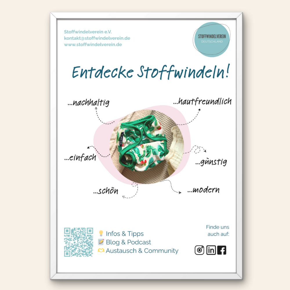 Der Aushang lädt dazu ein, Stoffwindeln als zeitgemäße Alternative zu entdecken. Gleichzeitig weist er auf die Angebote des Stoffwindelvereins e. V. hin – von Blog und Podcast bis zur Community.